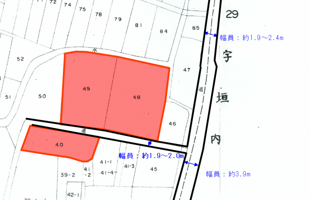 | 間口・接道 | 南 : 間口30m、道路幅員1.9m |