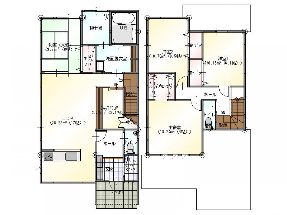 | 備考 | ④モデルには人気のスキップフロアをつくります。 お子様のスタディースペース・パパママのちょっとした息抜きのスペースとして・・・使い方は無限大。楽しんで住めるおうちになります。 17帖もあるLDKの先には6帖の和室。開放的な空間で家族時間を楽しんでください。 |