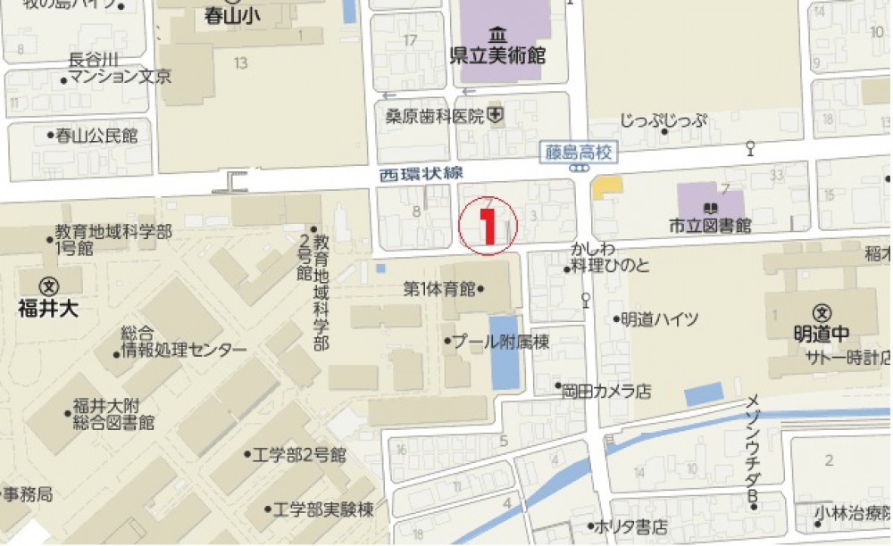 えちぜん鉄道三国芦原線 田原町 5分 、「市立図書館前」バス停より徒歩3分(約220m) |