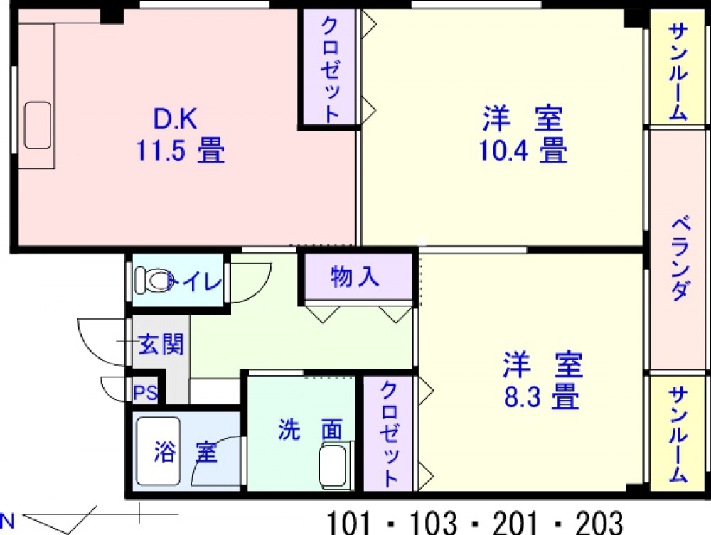 [2階] 洋室8.3帖、洋室10.4帖、DK11.5帖、バス・トイレ独立 |
