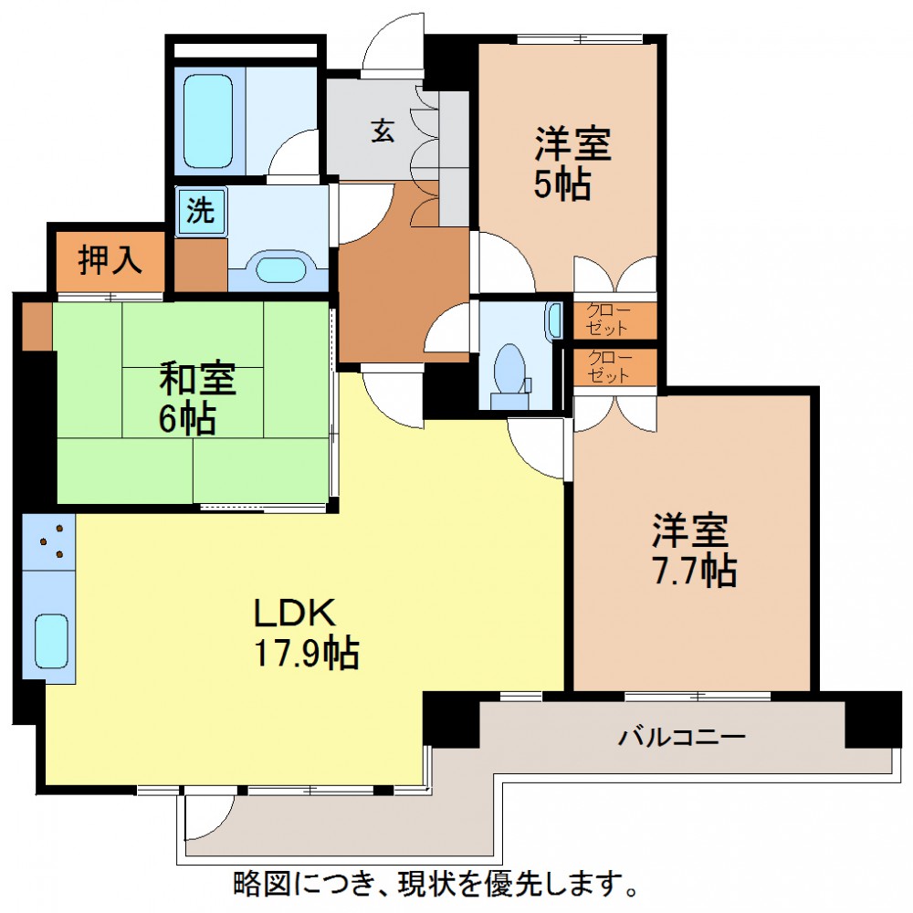 [3階] 洋室5帖、洋室7.7帖、和室6帖、LDK17.9帖、バス・トイレ独立 |