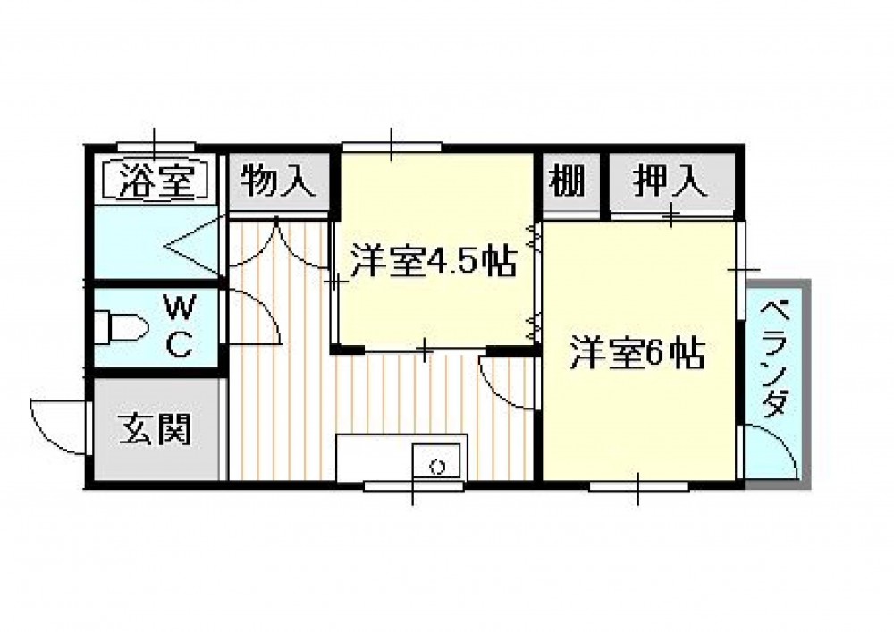 | 間取り | [2階] 洋室4.5帖、洋室6帖、K3帖、バス・トイレ独立 |