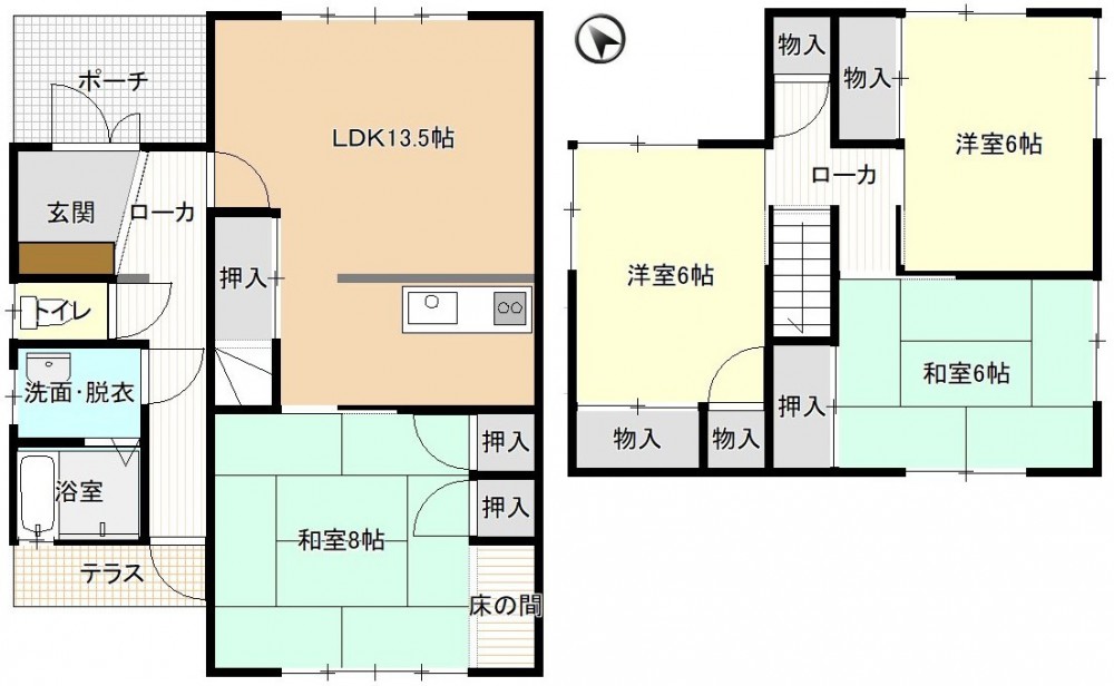 [1階] 和室8帖、LDK13.5帖、バス・トイレ独立 [2階] 和室6帖、洋室6帖、洋室6帖 |