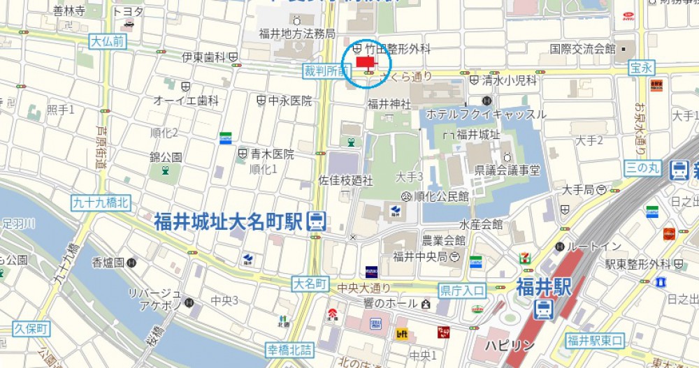 JR北陸本線 福井 10分 、「裁判所前」バス停より徒歩2分(約100m) |
