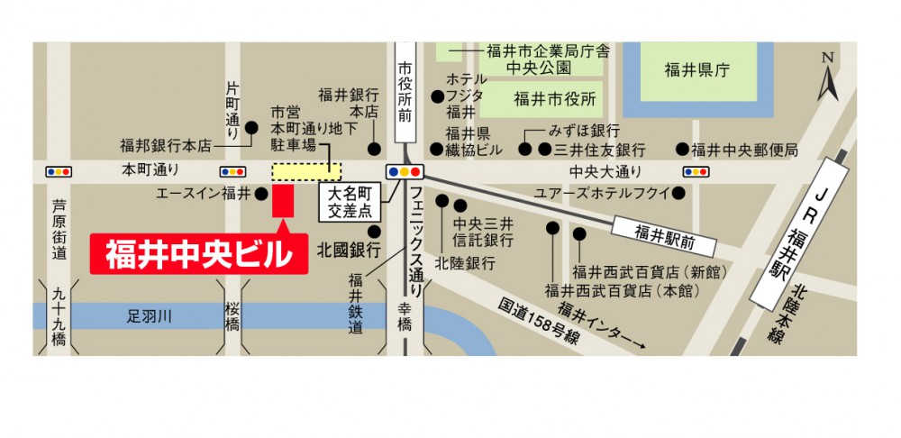福井鉄道福武線 福井城址大名町 4分 、「JR福井」駅より徒歩8分(約600m) |