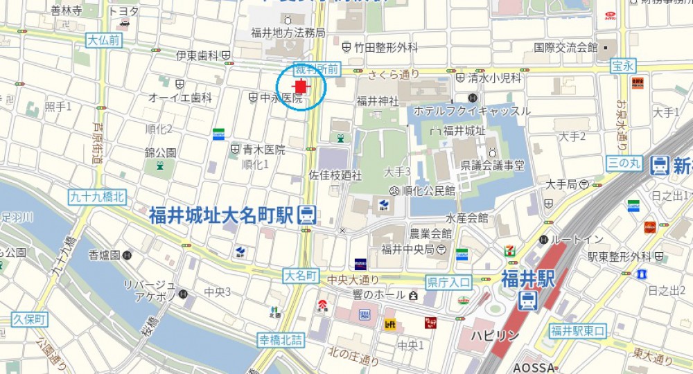 福井鉄道福武線 仁愛女子高校 0分 、「裁判所前」バス停より徒歩1分(約50m) |