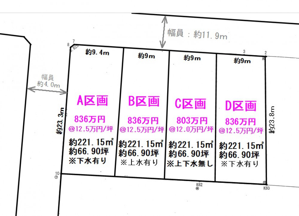 | 備考 | 上記金額・面積はC区画を記載。/分筆未完了の為、完了後は面積が変更になる可能性があります。/面積の相談可。/A・B・D区画:約66.9坪・836万円(A:下水有り・B:上水有り・D:下水有り)。 |