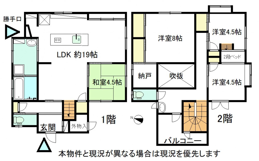 [1階] LDK19帖、和室4.5帖、バス、トイレ [2階] 洋室8帖、洋室4.5帖、洋室4.5帖、納戸2帖、トイレ |
