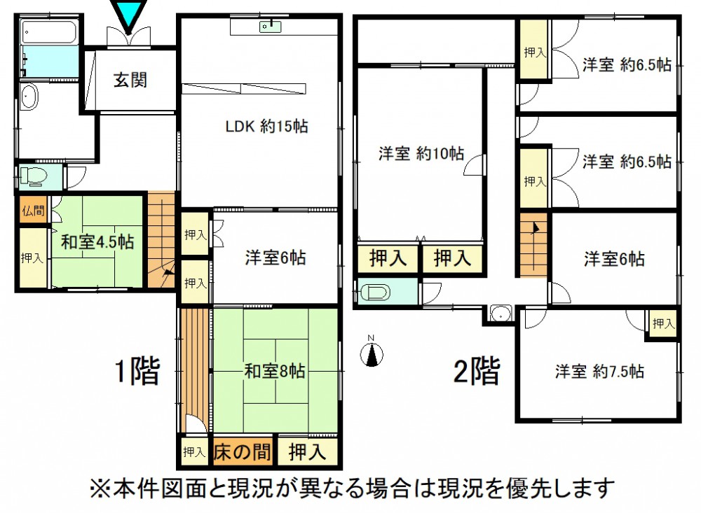 [1階] LDK15帖、洋室6帖、和室8帖、和室4.5帖、バス、トイレ [2階] 洋室10帖、洋室7.5帖、洋室6.5帖、洋室6.5帖、洋室6帖、トイレ |
