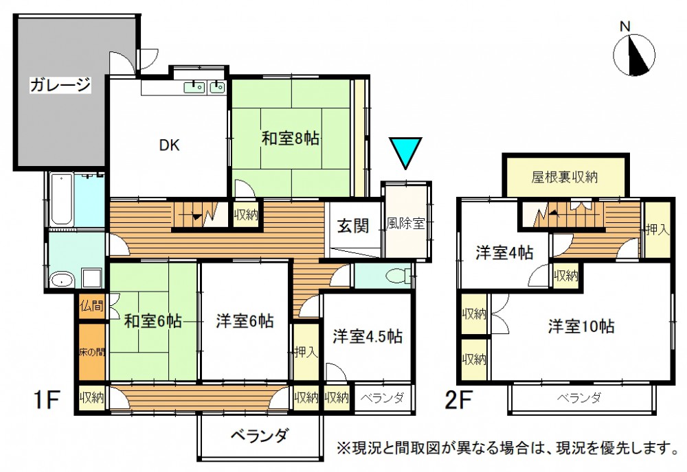 [1階] DK、和室8帖、洋室6帖、洋室6帖、洋室4.5帖、バス・トイレ独立 [2階] 洋室10帖、洋室4帖 |