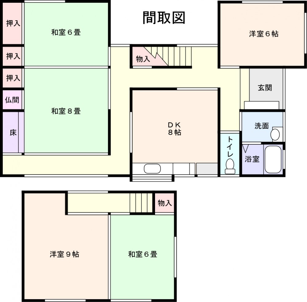 1階、 2階 /2階建 / [1階] DK 8帖 、 洋室 6帖 、 和室 8帖 、 和室 6帖 、 バス・トイレ独立 [2階] 洋室 9帖 、 和室 6帖