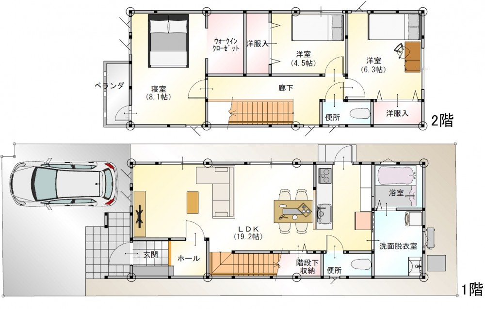 1階、 2階 /2階建 / [1階] LDK 19.2帖 、 バス・トイレ独立 [2階] 洋室 8.1帖 、 洋室 4.5帖 、 洋室 6.3帖 、 トイレ