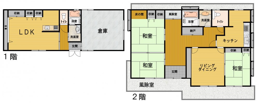 1階、 2階 /2階建 / [1階] LDK 、 倉庫 、 バス・トイレ独立 [2階] LDK 、 和室 、 和室 、 和室 、 バス・トイレ独立
