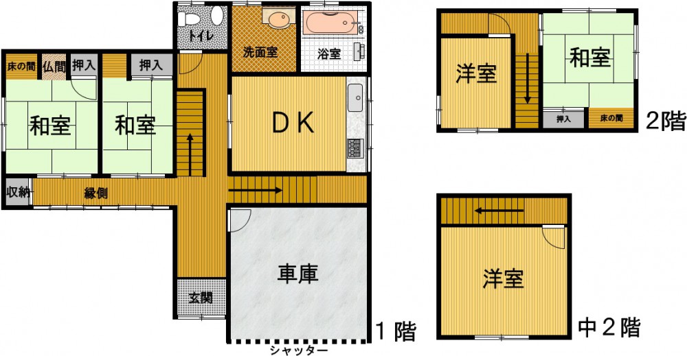 1階、 2階 /2階建 / [1階] DK 、 和室 、 和室 、 和室 、 バス 、 トイレ [2階] 和室 、 洋室 、 洋室 、 トイレ 、 納戸