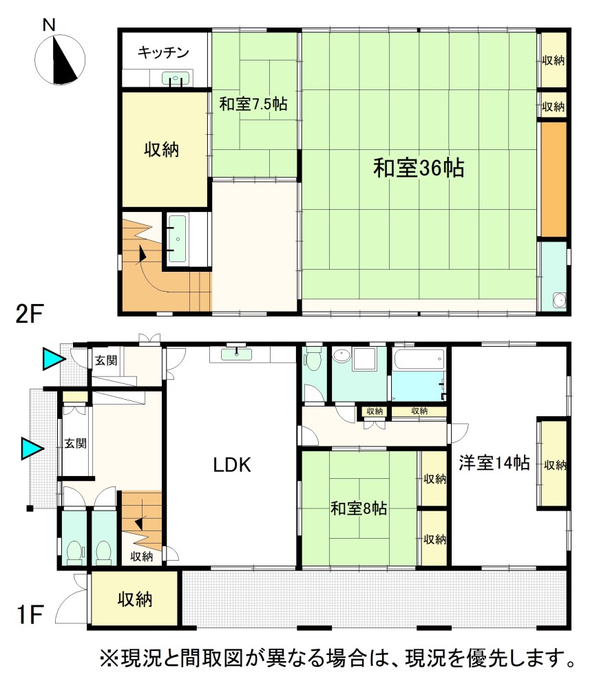[1階] 洋室14帖、LDK、和室8帖、バス、トイレ [2階] 和室36帖、和室7.5帖、納戸6帖、K |