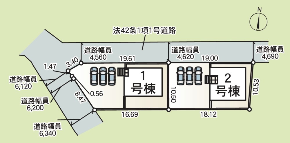北 : 間口4.6m、道路幅員19.6m