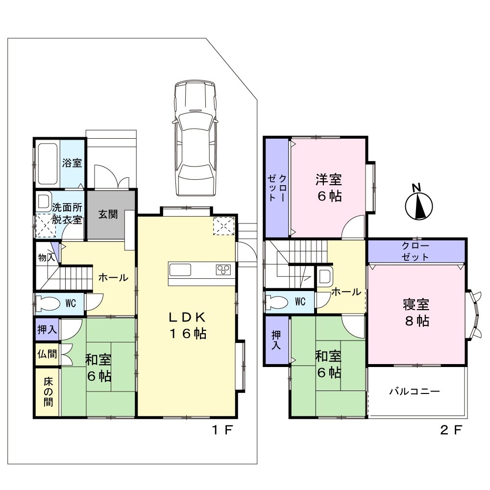 [1階] LDK16帖、和室6帖 [2階] 洋室8帖、洋室6帖、和室6帖 |