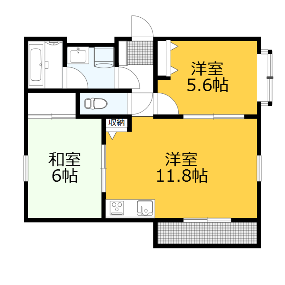2階 /2階建 / [2階] 和室 8帖 、 洋室 6.3帖 、 LDK 11.6帖 、 バス・トイレ独立