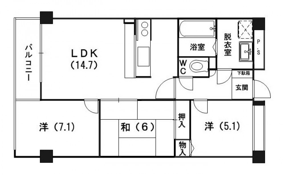 6階 /7階建 / [6階] 洋室 5.1帖 、 洋室 7.1帖 、 和室 6帖 、 LDK 14.7帖 、 バス・トイレ独立