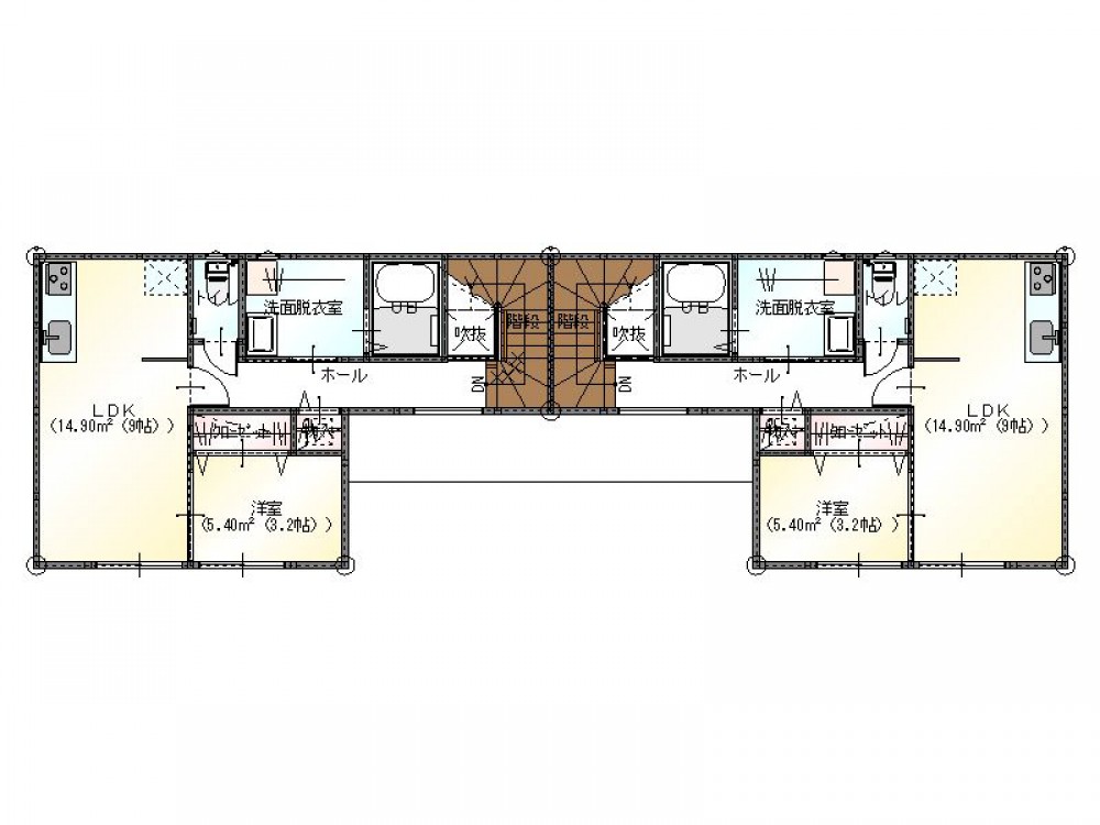 1階 /2階建 / [1階] リビング 9帖 、 洋室 3.2帖 、 バス・トイレ独立