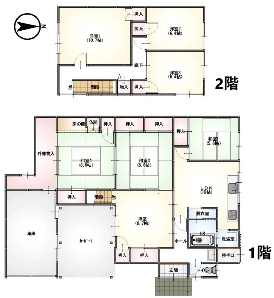 [1階] 和室5.6帖、和室8.6帖、和室8.6帖、洋室8.7帖、LDK10帖 [2階] 洋室10.7帖、洋室6.4帖、洋室6.4帖 |